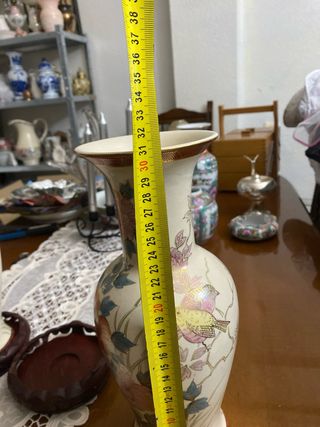 Precioso jarrón de estilo chino, con un diseño detallado y colorido. - Motivos florales y escenas. - Borde superior dorado.