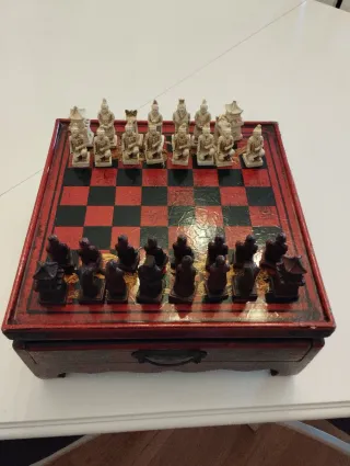 Conjunto de ajedrez de estilo asiático con tablero y piezas. De madera lacada y pintado a mano