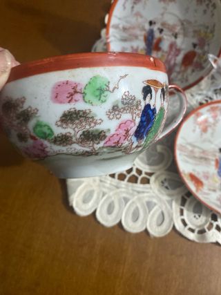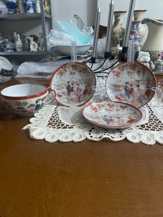 Conjunto de porcelana antigua de estilo japonés, ideal para coleccionistas. - Incluye una taza y tres platos pequeños. - Diseño con figuras y motivos florales. - Borde decorado en rojo.