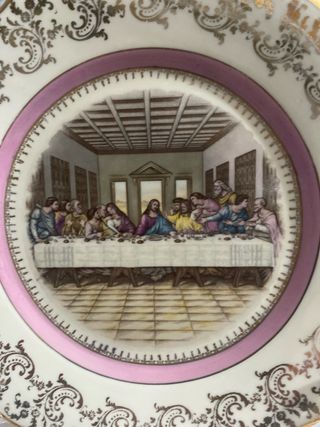 Precioso plato de porcelana antigua con una escena de La Última Cena en el centro. El borde está decorado con un intrincado diseño floral en dorado y un delicado ribete rosa. - Diseño clásico. - Borde festoneado. - Detalles dorados. - Imagen central de La Última Cena.