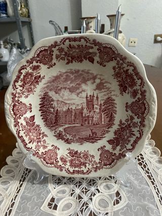 Precioso plato antiguo de porcelana inglesa Royal Bomez con un diseño detallado. - Motivo de castillo y ciervo. - Borde decorado con flores y motivos ornamentales. - Color: Rojo y crema. - Representa Castillo Balmoral