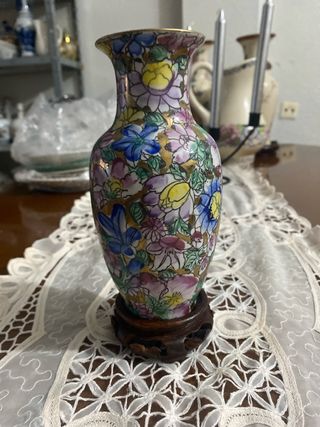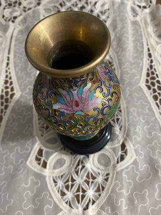 Precioso jarrón antiguo de estilo chino Cloisonné. Su diseño intrincado y colores vibrantes lo convierten en una pieza decorativa única. - Técnica Cloisonné. - Motivos florales. - Base de madera incluida.