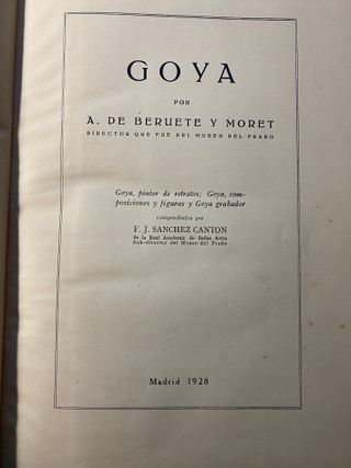 Libro sobre la obra de Goya, escrito por A. de Beruete y Moret. - Compendiado por F. J. Sanchez Canton. - Publicado en Madrid en 1928. Láminas con fotografías b/n. Tapas y interior en buen estado, mas alla del normal uso y los 98 años de antiguedad del ejemplar.