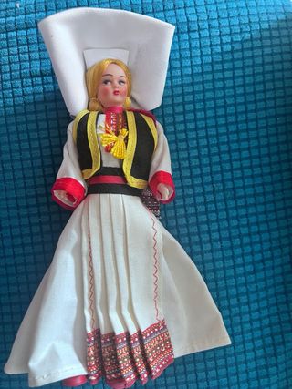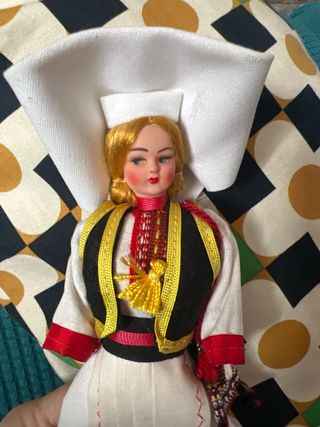 Muñeca años 50 con vestimenta tradicional de Europa del Este. 22cm - Traje típico bordado. - Sombrero blanco característico. - Detalles en hilo dorado y rojo. -Hago los envíos desde Canarias por Correos. 📦 -Para envíos certificados a veces puede haber tasas de aduanas, y son a cargo del comprador.
