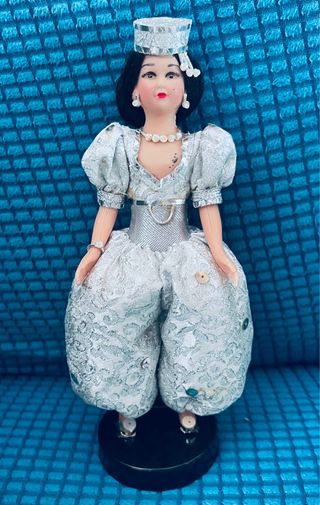 Muñeca de colección con traje folclórico de Túnez. 20 cm aprox. - Vestido plateado con detalles. - Corona y accesorios. - Brazalete y pendientes. -Hago los envíos desde Canarias por Correos. 📦 -Para envíos certificados a veces puede haber tasas de aduanas, y son a cargo del comprador.