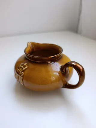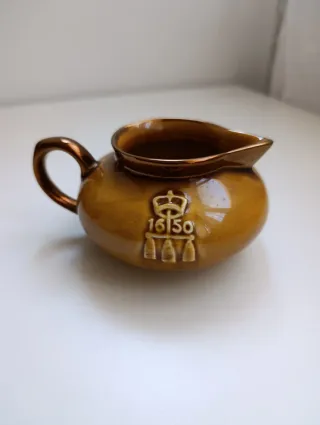 Jarra de leche/crema vintage de la colección "Boston Tea Parties" de Davison Newman & Co. El artículo es una jarra conmemorativa de color mostaza o dorado que hace referencia a los eventos del Boston Tea Party de 1773-1774. Fabricado en las décadas de 1950 u 1970. Se encuentra en perfecto estado.