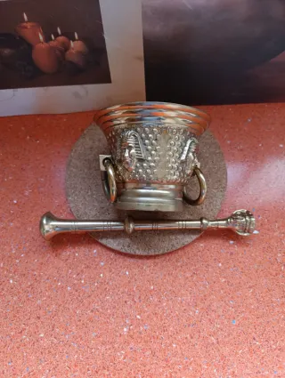 Este es un almirez de bronce con un diseño intrincado medidas de 13x 10 cms un mortero a juego medida de 23 cms y con un peso total de 1.500 kg - Material: Bronce. - Diseño decorativo con rostrosy anillas. - Incluye mortero.
