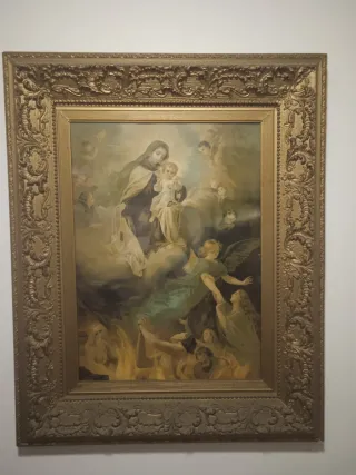 Pintura antigua de temática religiosa, datada en el siglo XIX. Representa una escena celestial con la Virgen María y el Niño Jesús, rodeados de ángeles y figuras en la parte inferior. - Marco dorado ornamentado. - Lienzo con detalles de época.