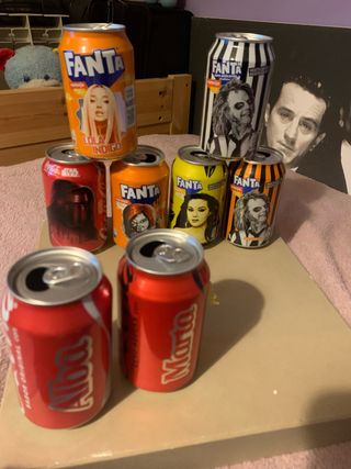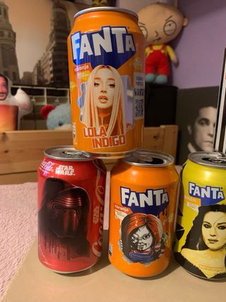 Variedad de latas de Fanta y Coca Cola con ediciones especiales. Están vacías Precio según cantidad a comprar 1 lata 3€ 2 latas 5€ 3 latas 6€ TODAS POR 10€ Bitelchus Star Wars Muñeco Diabólico Lola Índigo Chucky Beetlejuice