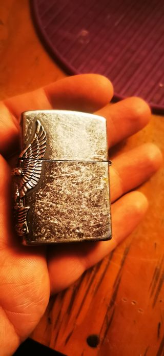 Mechero metálico con diseño de águila. - Acabado plateado con detalles. - Diseño de águila en relieve.