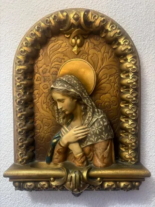 Antigua benditera o retablo de escayola con un diseño detallado. - Figura central de la Virgen María. - Marco ornamentado con motivos florales. - Acabado dorado envejecido.