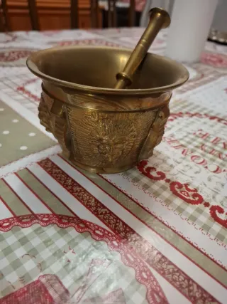 Este mortero y mano son de bronce, con un diseño antiguo y decorado. - Material:bronce - Diseño antiguo con grabados.