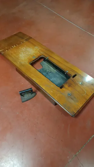 Tablero de madera para máquina de coser con hueco para la máquina y una pequeña plancha decorativa. - Tablero de madera. - Plancha decorativa de hierro.