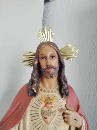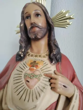 Figura del Sagrado Corazón de Jesús, obra de Olot. -Mide 50 cm, ojos de cristal, sellada talleres Olot. - Representación religiosa. - Detallada escultura.