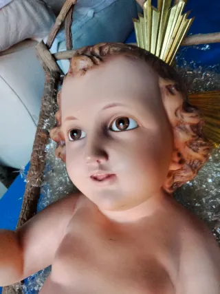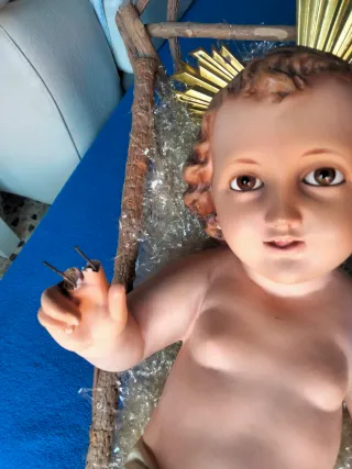 Figura del Niño Jesús, ideal para belenes o representaciones de la Natividad. Fabricada en Olot. -Mide 47 cm, ojos de cristal,pertenece a los talleres Olot. - Detallada figura. - Estilo tradicional.