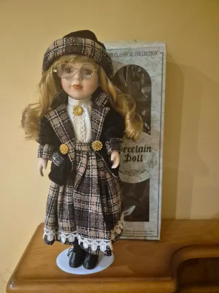 Muñeca de porcelana de la The Classical Collection de 40 cm. - Vestido de cuadros - Gorro a juego - Gafas redondas. - Base para exponerla de pie.
