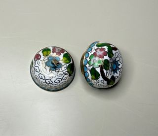 Caja Hermetica formada por Dos piezas decorativas de estilo chino en forma de Manzana 🍏con un diseño floral y detalles en cloisonné que sirve como ambientador , se le coloca perfume en su interior o incienso y desprende olor a traves del palito superior de la manzana que es hueco Motivos florales en blanco, rosa, azul y verde. - Bordes metálicos dorados. - Acabado esmaltado brillante.