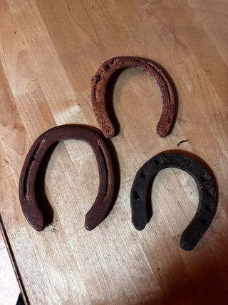 Conjunto de tres herraduras, ideales como amuleto de buena suerte. Presentan un aspecto rústico y vintage. - Herradura de color óxido con detalles de alambre. - Herradura de color óxido con acabado liso. - Herradura de color negro.