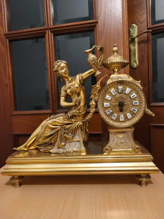 Elegante reloj de sobremesa de estilo antiguo, con una figura femenina dorada. - Base dorada con patas decorativas. - Figura femenina con jarrón. - Esfera con números romanos.