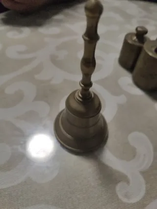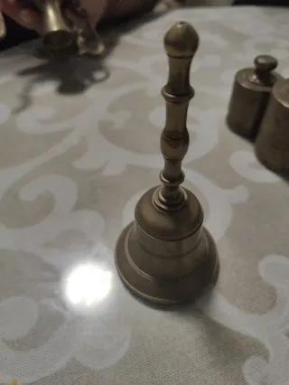 Campanilla de servicio antigua de bronce. Su diseño clásico la hace ideal para cualquier espacio. - Material: Bronce - Acabado: Dorado