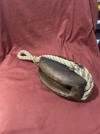 Pieza de polea de barco antigua, fabricada en madera robusta y con una cuerda gruesa. - Material: Madera. - Incluye cuerda. Antigua Antiguedades decoración colección coleccionista coleccionismo Tinajas hijas mesas silla muro madera, cobre sosos, barcos barquilla marcas Molino molinillo morteros Antiguo. Antigüedad. Decoración colección coleccionista coleccionismo