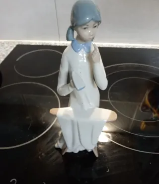 Figura de porcelana de una sirvienta, estilo vintage. - Diseño detallado. - Acabado en blanco y azul.