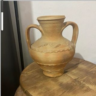 Tinaja antigua de barro con asas y decoración. - Material: Barro - Color: Terracota - Diseño: Tradicional con asas y detalles decorativos en relieve. Antiguo, antigüedad, decoración, colección coleccionista, Tinajas, Tinajas, cántaro, candiles, candelabros, mortero Molino, molinillos, tallas de madera, decoración, colección herramienta, colección coleccionista, coleccionismo