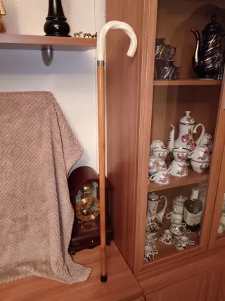 Bastón con un diseño clásico y un mango curvo para un agarre cómodo. - Mango de color blanco marfil. - Cuerpo de madera clara. - Detalle metálico plateado en el cuello. - Punta de goma negra en la base.