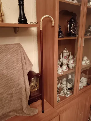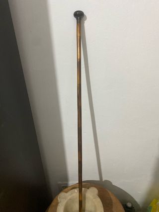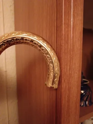 Bastón con un diseño clásico y un toque de distinción. - Empuñadura curva con acabado dorado. - Mango metálico creo k es bronce - Punta de goma negra.