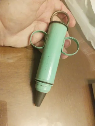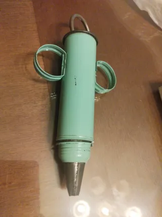 Herramienta vintage para decorar pasteles y postres. Ideal para aplicaciones de glaseado y cremas. - Cuerpo cilíndrico de color verde menta. - Dos asas laterales para un mejor agarre. - Punta cónica metálica.107 cm largo aprox.
