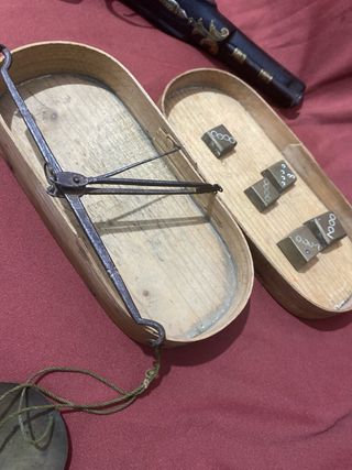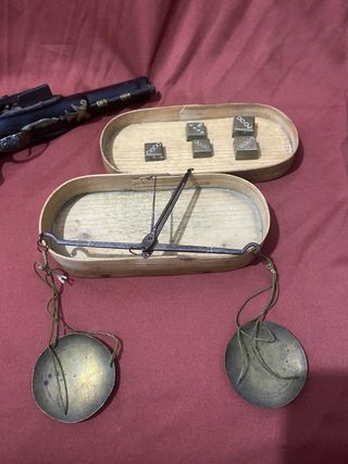 Balanza de precisión antigua con su caja. - Incluye juego de pesas. - Materiales: madera y metal. Antiguo Antiguedades balanza básculas Molino molinillo morteros Tinaja vasijas mesas sillas, mueble madera bronce, medio metal cobre Tinajas y cajones Antiguedades antiguas Antigua, tallas de madera, decoración, colección coleccionista, coleccionismo
