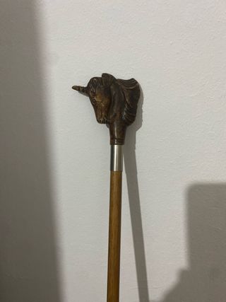 Bastón antiguo con un diseño único en la empuñadura. - Empuñadura tallada con forma de cabeza de caballo. - Detalle metálico en la unión del mango. - Mango de madera. Antiguo, antigüedad es vasija mesas sillas, mueble madera, bronce, aluminio, metal, cobre Antigua Antigüedades decoración balanzas Tinajas. Cántaros candelabros lámparas Antigua antigüedades decoración colección coleccionista coleccionismo