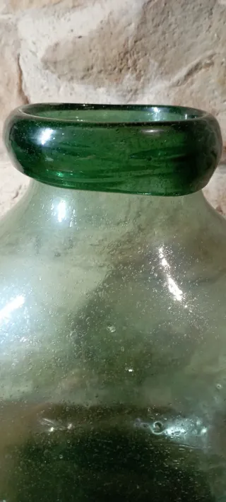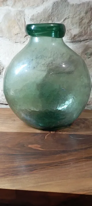 Garrafa damajuana antigua de vidrio soplado. Pieza decorativa con un encanto rústico. - Material: Vidrio soplado. - Color: Verde. - Diseño: Forma achatada con cuello ancho. Mide 35 cm. de alto.