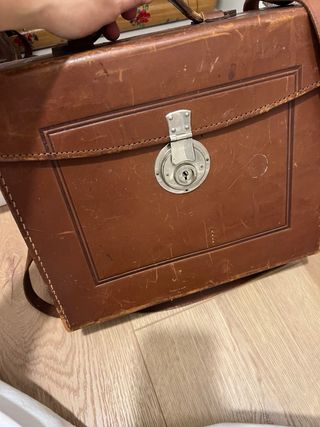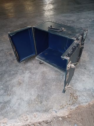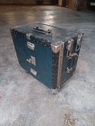Preciosa maleta de atrezo antigua, hecha a mano. Con un diseño clásico y ruedas. Revestimiento exterior de cuero sintético color azul, ideal para coleccionistas o como elemento decorativo. Estructura robusta, cierre con varias hebillas metálicas. Asa superior para transporte. Presenta señales de uso y desgaste, lo que le da un encanto vintage. Medidas: 47 cm x 29 cm fondo x 47 cm alto