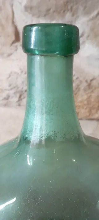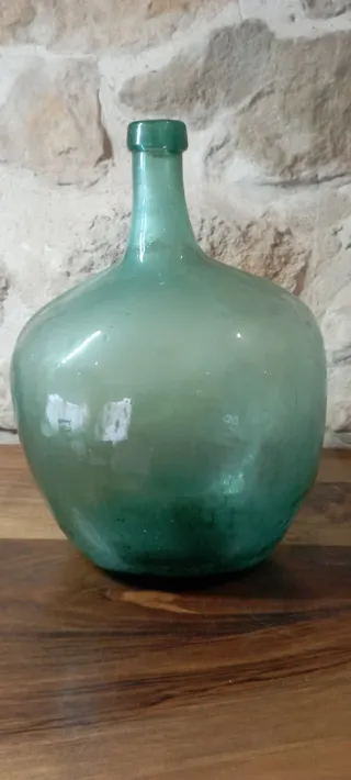 Botella antigua de vidrio soplado, también conocida como damajuana. Su diseño artesanal la hace única. - Material: Vidrio soplado. - Color: Verde translúcido. Mide 34 cm. de alto