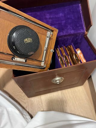 Exclusiva cámara fotográfica antigua de madera, equipada con el prestigioso objetivo Carl Zeiss Jena Tessar 16,5 cm f/3.5. Se entrega con su estuche original forrado en terciopelo y varios chasis para placas, formando un conjunto completo y difícil de encontrar. Pieza de alto valor histórico y coleccionable, ideal para coleccionistas exigentes o decoración vintage de nivel. Conserva todos sus elementos originales y presenta un excelente estado estético para su antigüedad. Entrega en mano o envío protegido. Se valoran ofertas serias.