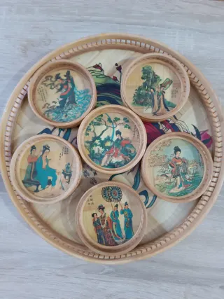 Conjunto de bandeja y seis posavasos de estilo asiático vintage. Cada posavasos presenta una ilustración detallada de figuras y escenas tradicionales. - Bandeja redonda de madera con diseño. - Seis posavasos circulares con motivos orientales. - Ideal para decoración o uso.