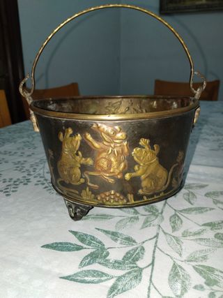 Este caldero antiguo está hecho de cobre o latón y presenta un diseño decorativo en relieve. Tiene un asa para facilitar su transporte. - Material: Cobre o latón - Diseño: Relieve con figuras - Asa: Sí