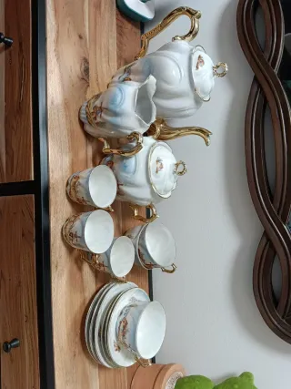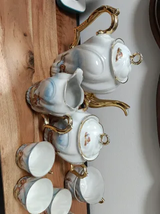 Conjunto de porcelana antigua con un diseño pintado a mano. Ideal para coleccionistas o para añadir un toque vintage a tu hogar. - Incluye tazas y platos. - Decoración con escenas y detalles dorados.Algunas señales del tiempo. - Piezas de alta calidad.El dorado algo descolorido.