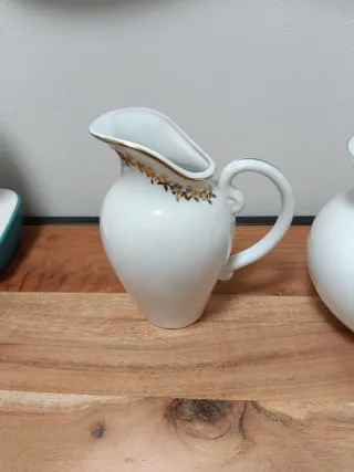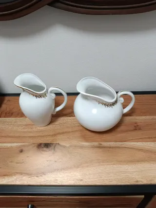 Conjunto de dos lecheras de cerámica blanca con un delicado borde dorado. - Diseño clásico y elegante. - Ideal para coleccionistas o decoración.Alguna señal del tiempo.Ver fotos
