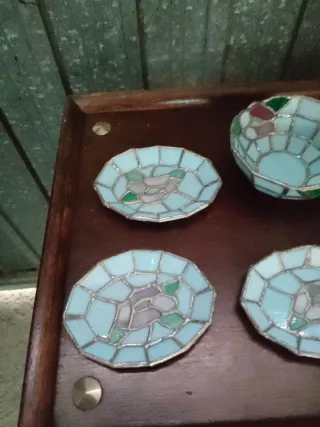 Conjunto de bombonera y tres ceniceros antiguos apilables. Piezas decorativas o de colección. Tienen algún defecto, como se ve en la foto. Parece que es algo pegado, pero supongo que desaparecerá con un producto específico