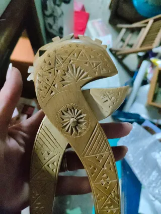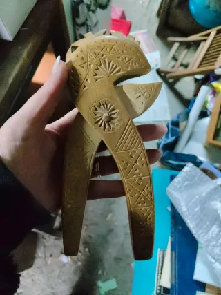 Cascanueces de madera con un diseño artesanal y detalles tallados. - Material: Madera. - Diseño: Tallado con motivos geométricos y florales. - Mecanismo: Tipo alicate. Se envía mediante Wallapop