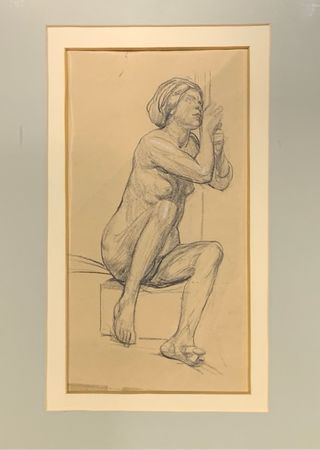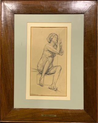 Dibujo original de la artista inglesa Mary Sargant-Florence (1857-1954). Carboncillo son toques de clarión. Alrededor de 1900. Hermana del escultor Francis Willian Sargant. Buen estado con señales del paso del tiempo y con marco de época. Medidas con marco: 49,5 x 63 cm. - Representación de una figura femenina desnuda y sentada. - Técnica de carboncillo o lápiz con toques de clarión sobre papel.