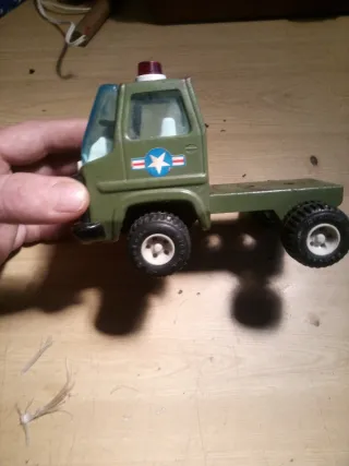 Camioncito de juguete de estilo militar, ideal para coleccionistas. - Color verde militar. - Diseño de camión con plataforma. - Insignia de estrella azul con barras rojas en el lateral.