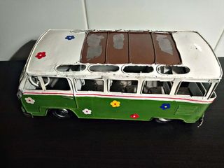 Furgoneta antigua Hippie hecha y pintada a mano. Es una pieza única, no hay otro igual Medidas (31 cm. de largo) (13 cm. de ancho) (12 cm. de alto) Se envía bien protegido. Se incluye una muñeca hecha a mano de ganchillo con ropa hippie. La furgoneta tiene algún signo de desgaste de los años que tiene. Está tal cual en las fotos.