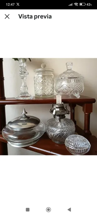 Antigüedades y vintage para disfrutar, ⚠️descripción y precios de cada artículo⚠️ contactar para venta individual. Antiguo joyero en cristal de plomo años 50, con un trabajo de talla espectacular, 17 cmts altura total con tapa, 8,5 cmts sin tapa y 12,5 cmts diámetro.💰30€ Galletera, dulcera, bombonera... Antigua pieza años 50, estanho 95%, 19 cmts de diámetro y 13 cmts altura total.💰 30€ Gran galletero, pot a biscuits, tarro jengibre... Magnífico cristal de plomo tallado corte diamante, Austria, 18 cmts de altura total con tapa y 11 cmts diámetro. 💰30€ Candelero vintage años 60, France,20 cmts de altura 💰 15 €