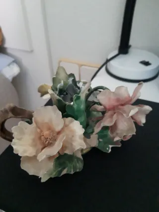 Bonito candelero decorativo con forma de flores de porcelana.,,Porcelana CAPODIMONTI - Diseño floral delicado. - Tonos pastel. - Presenta un defecto visible en una de las hojas.