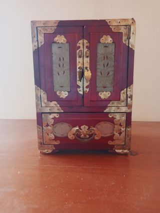 Elegante joyero vintage de estilo chino, con detalles en jade tallado y herrajes dorados. - Madera oscura con acabado brillante. - Incrustaciones de jade tallado en puertas y cajón. - Herrajes metálicos dorados con diseño ornamental.