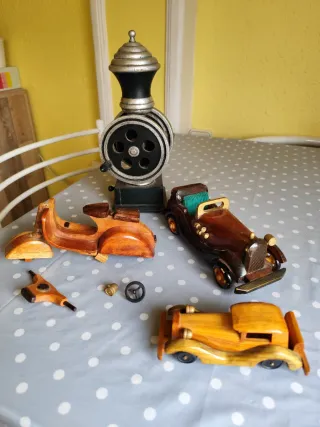 Conjunto de vehículos de madera de estilo vintage. - Coche clásico de madera oscura. - Coche tipo roadster de madera clara. - Scooter de madera. - molinillo de madera Medidas de entre 26 cm de alto el molinillo hasta el coche más pequeño 12 cm la Vespa 18 cm de largo hay que pegar el volante y la horquilla al otro coche hay que pegar el volante y un faro medida de éste 20 cm, PRECIO POR TODO NO NEGOCIABLE NO VENDO POR SEPARADO ENVIOS EN 24 -48 HORAS POR WALLAPOP