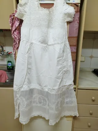 Vestido antiguo de comunión, confeccionado a mano con delicado encaje. - Diseño clásico y atemporal. - Detalles de encaje intrincado en el corpiño y mangas. - Bajo con volantes y puntilla. Con bolsito de seda y abrazadera de seda